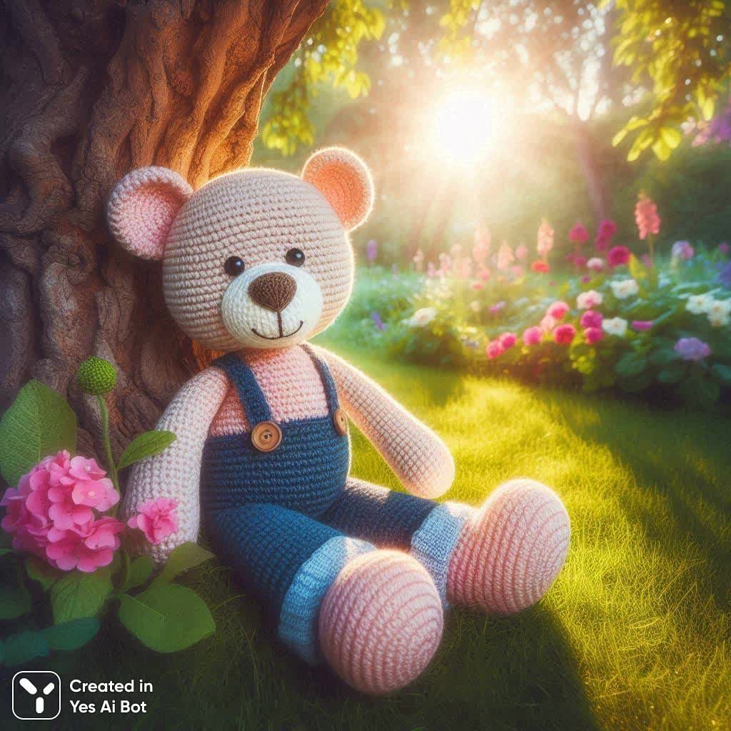 medium-sized crochet teddy bear, wearing oversized pink sweater and blue jeans, sitting against a tree in a sunny park, smiling face with stitched nose and button eyes, playful yet cozy atmosphere, bg is lush green grass and blooming flowers.