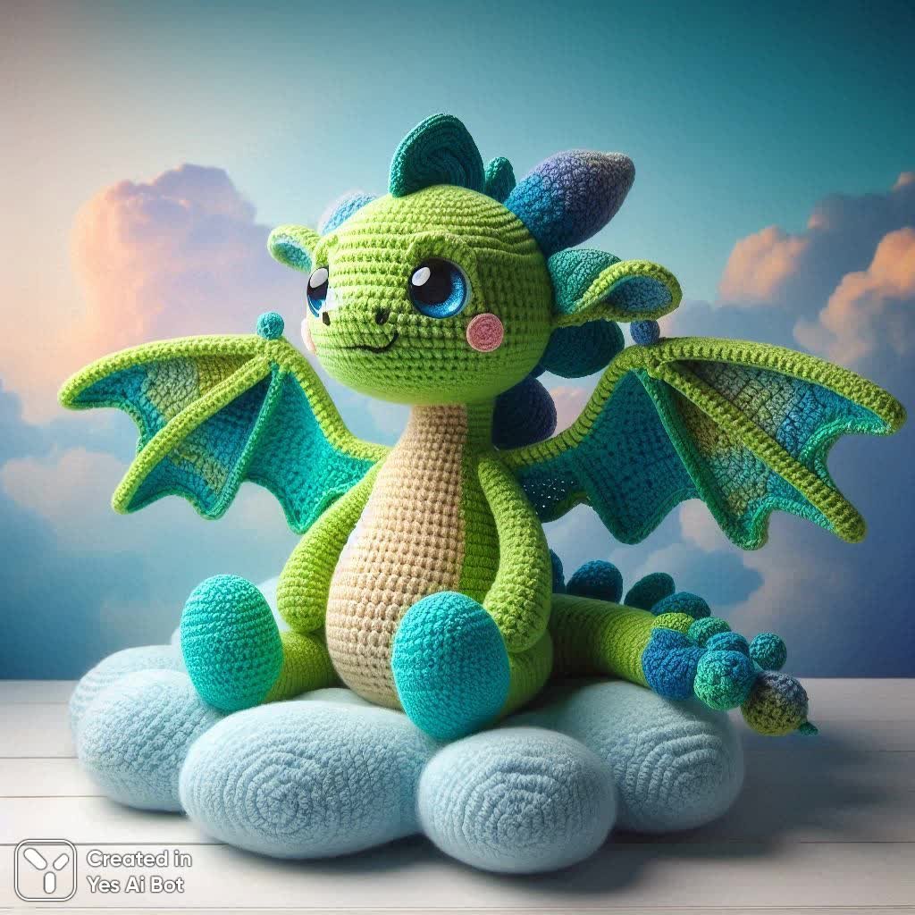 crocheted dragon toy in vibrant colors, large wings made of green and blue yarn, sitting on a soft cloud-shaped cushion, playful expression with big round eyes and tiny fangs, bg is a pastel blue sky.