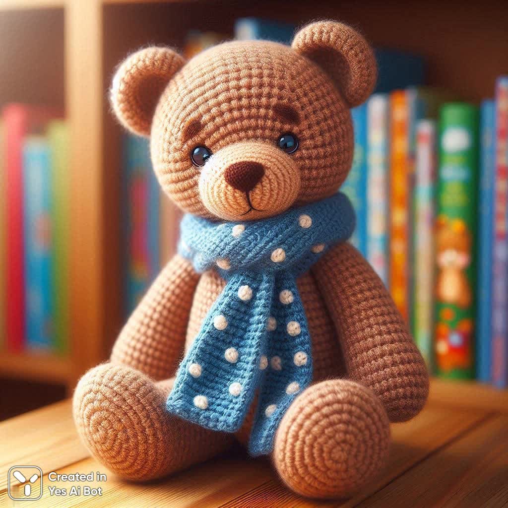 crocheted teddy bear sitting upright, made from brown yarn, wearing a blue scarf with white polka dots, big round eyes and stitched nose, placed on a shelf with children's books in the background, warm and inviting atmosphere.