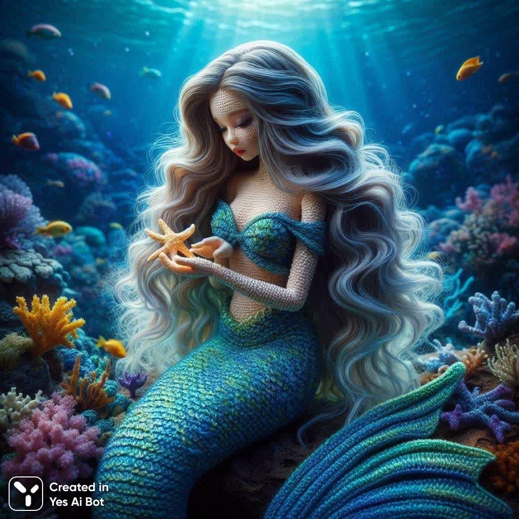 crocheted mermaid doll, shimmering scales in shades of blue and green, long hair cascading down in waves, holding a tiny starfish, background is an underwater scene with colorful coral and fish, enchanting and magical vibe.