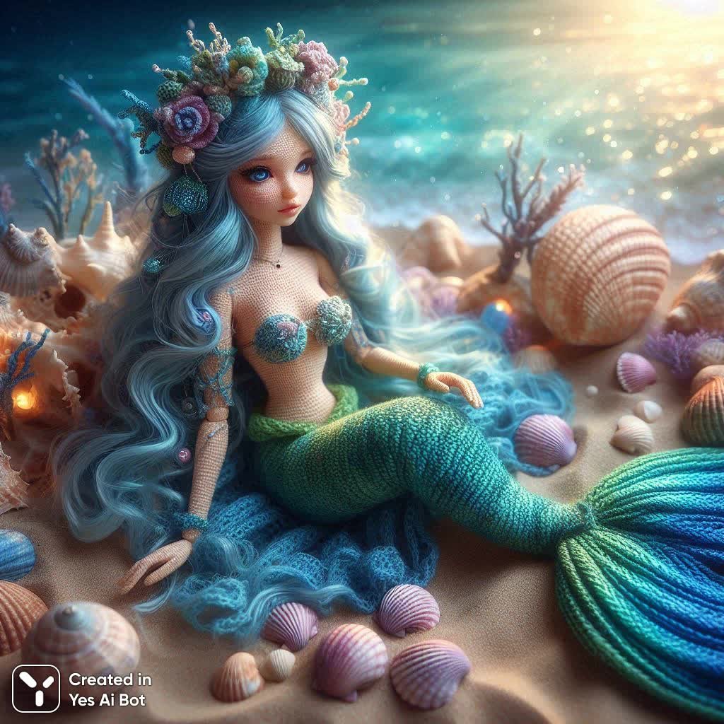 crocheted mermaid doll with long blue hair and a sparkling green tail, wearing a shell top, sitting on a sandy beach background with seashells scattered around, whimsical and magical atmosphere.