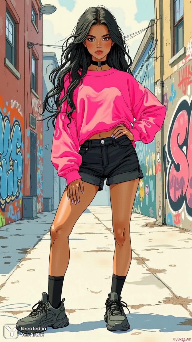 #1. illustration, ink drawing, posing in neon pink oversized t-shirt with long sleeves, high-waisted black shorts, chunky sneakers, long black hair in loose waves, standing in urban setting with graffiti wall in background, edgy vibe #role_fashion_model