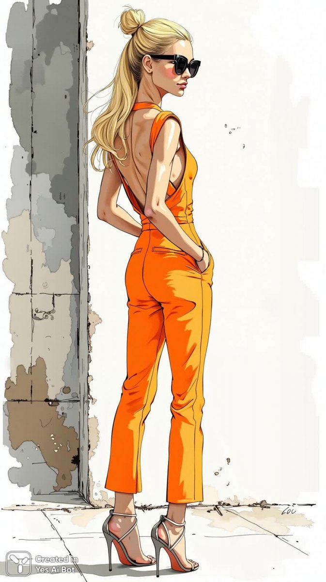 #3. illustration, ink drawing, standing in neon orange jumpsuit with low back and structured shoulders, high heels, wearing oversized black sunglasses, long blonde hair pulled into a sleek bun, minimalist industrial backdrop #role_fashion_model