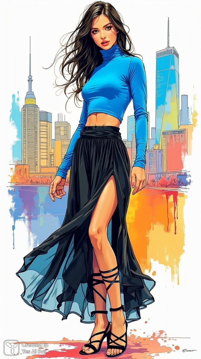 Завораживающая иллюстрация в технике туши передает образ современной и уверенной в себе модели. Яркие неоновые цвета создают контрастный фон для стильного наряда: топ насыщенного синего оттенка с длинными рукавами и высоким воротником, элегантно сочетается с воздушной черной макси-юбкой из полупрозрачной ткани. Изящные босоножки на тонких ремешках завершают образ, подчеркивая женственность и утонченность. Длинные темные волосы, ниспадающие волнами, добавляют драматизма и загадочности. Модель эффектно позирует на фоне городского пейзажа, излучая силу и энергию. Каждая деталь тщательно проработана, создавая ощущение динамики и живости. Эта иллюстрация – воплощение современной моды и стиля, сочетающее в себе смелость, элегантность и артистизм. В ней чувствуется влияние уличной культуры и высокой моды, что делает ее особенно привлекательной для ценителей современного искусства и модных тенденций. Изображение вызывает ощущение движения и свободы, а яркие цвета притягивают взгляд и заряжают позитивной энергией. Это настоящий визуальный шедевр, который не оставит равнодушным никого