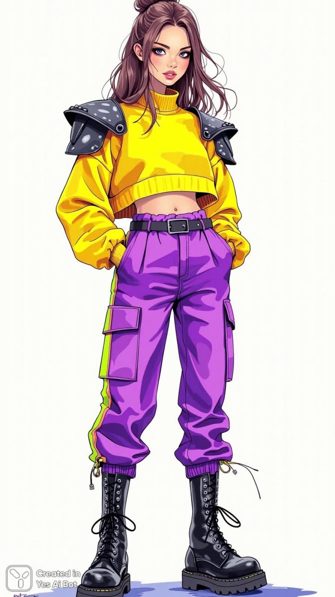 illustration, ink drawing, fashion model, neon colors, exhibiting a colorful ensemble featuring a cropped yellow sweater with high shoulder pads, bright purple high-waisted trousers, and chunky black combat boots, long wavy hair in a half-up style, radiating a playful and edgy attitude.