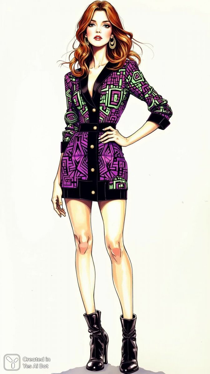 Яркая иллюстрация в технике тушевой графики представляет собой стильный образ современной модной модели. Она уверенно позирует перед камерой, демонстрируя эффектный наряд – короткое черное платье с дерзкими геометрическими узорами насыщенных пурпурных и зеленых оттенков, словно светящихся неоном. Завершают ансамбль элегантные ботильоны на высоком каблуке и массивные кольца в виде серег-обручей. Прическа модели выполнена в виде драматичных локонов, а взгляд, направленный прямо в камеру, излучает силу и уверенность. Картина передает атмосферу моды, творчества и энергии, используя смелые цветовые решения и акцентируя внимание на деталях кроя и аксессуаров. Это визуальное воплощение современной женственности и индивидуального стиля, сочетающее в себе классическую элегантность и авангардные элементы дизайна. Изображение обладает динамикой и привлекает взгляд своей яркой палитрой и выразительной композицией, создавая впечатление живого момента с показа мод или фотосессии