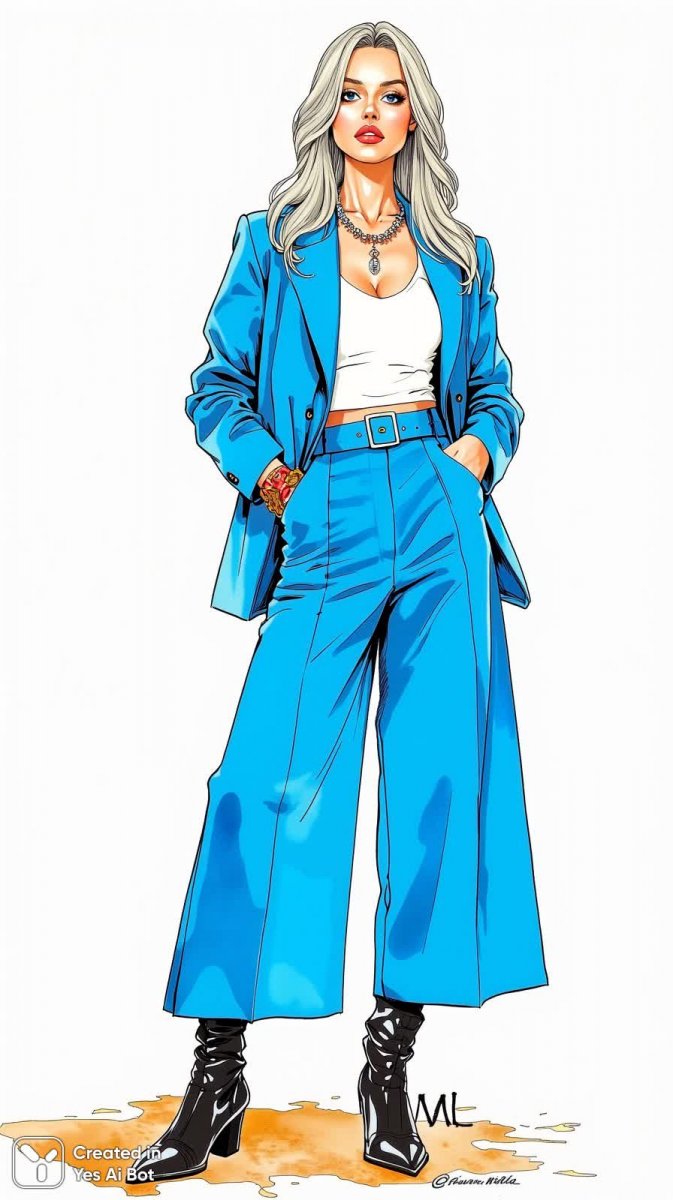 illustration, ink drawing, fashion model, neon colors, standing in dynamic pose while wearing a neon blue tailored suit with a cropped blazer and wide-legged pants, white tank top underneath, paired with stylish ankle boots, long silver hair styled straight and sleek.