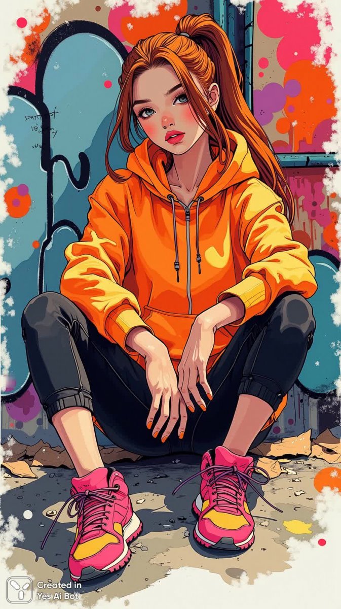 illustration, ink drawing, fashion model, neon colors, sitting against a graffiti wall, showcasing an oversized futuristic neon orange hoodie and sleek black leggings, completed with neon pink sneakers, long auburn hair worn in a sleek ponytail.
