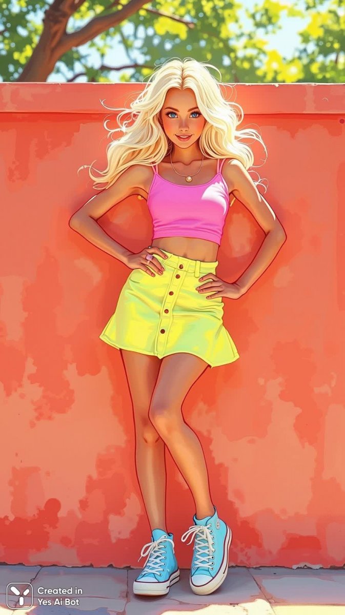 a trendy bimbo girl, platinum blonde hair styled in loose waves, is playfully standing by a vibrant coral-colored wall. she wears a neon pink crop-top with a subtle glow, a luminous yellow skirt, and bright pastel blue high-top sneakers. her hands are on her hips, and she has a joyful smile on her face. soft sunlight filters through the trees in the background, creating a cheerful and lively atmosphere. confident pose, natural expression, fashion-forward style.
