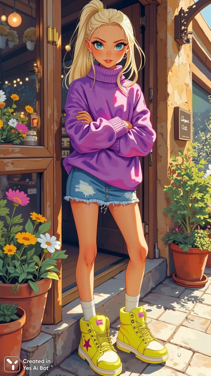 a chic bimbo girl, platinum blonde hair in a sleek ponytail, stands boldly near a rustic cafe entrance. she wears a radiant neon purple oversized sweater, a luminous denim mini skirt, and striking neon yellow platform sneakers. she crosses her arms with a confident smirk, emanating an aura of self-assuredity. the background is adorned with charming flower pots and soft fairy lights, creating a whimsical environment. bold and expressive, trendy urban atmosphere, inviting and warm mood.