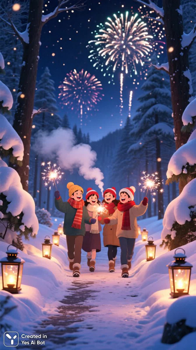 A snowy forest path lined with lanterns, a group of friends in winter hats carrying sparklers and laughing, hints of New Year’s fireworks in the night sky, magical realism inspired by Studio Ghibli, glowing snowdrifts, animated movement in scarves and breath clouds, enchanted atmosphere, high detail, cgi, 1024K