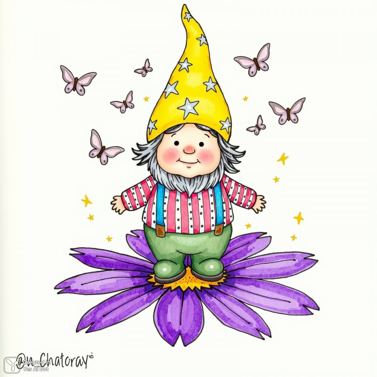 #1. ink drawing of small gnome figurine with pink and blue vertical stripes, round face and big smile, wearing yellow hat with silver stars and green suspenders, standing on a purple flower with tiny butterflies in the background #role_toys