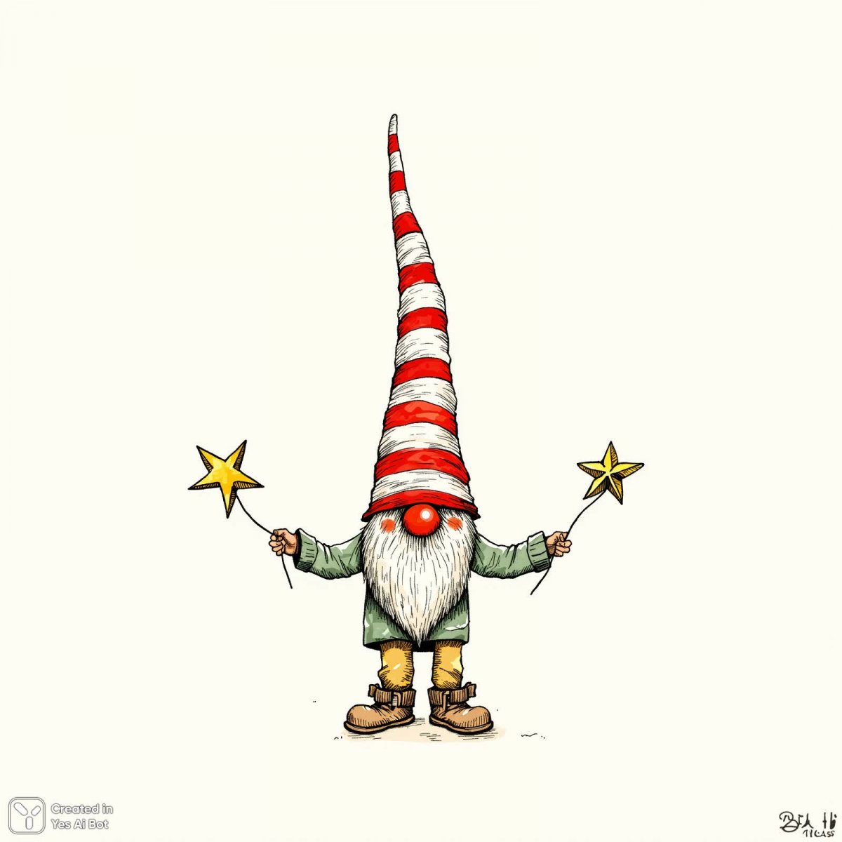 #1 ink drawing, illustration, naive art, doodling, zentangle, folk art, cartoonish, paper cut gouache illustration small gnome figurine with a striped hat and fuzzy body, holding two gold stars in hands, beige pants and red nose, BG is plain white #role_toys