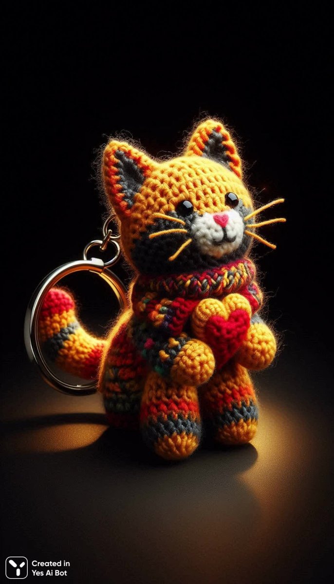 crocheted keychain in shape of cat, different colors and patterns including orange and yellow, attached to silver metal ring with a red heart, cozy and festive.