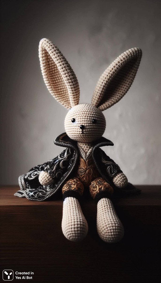 small crochet bunny toy, two large ears on top, sitting on hind legs, outfit made of black, white and gold fabric, bg is white wall.