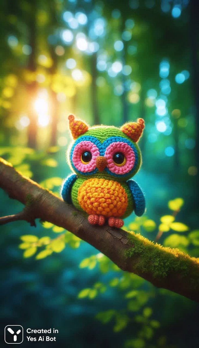 little crocheted owl in bright colors, big round eyes and tufted ears, perched on a branch of a tree, cozy atmosphere with soft sunlight filtering through leaves, playful style, bg is blurred forest.