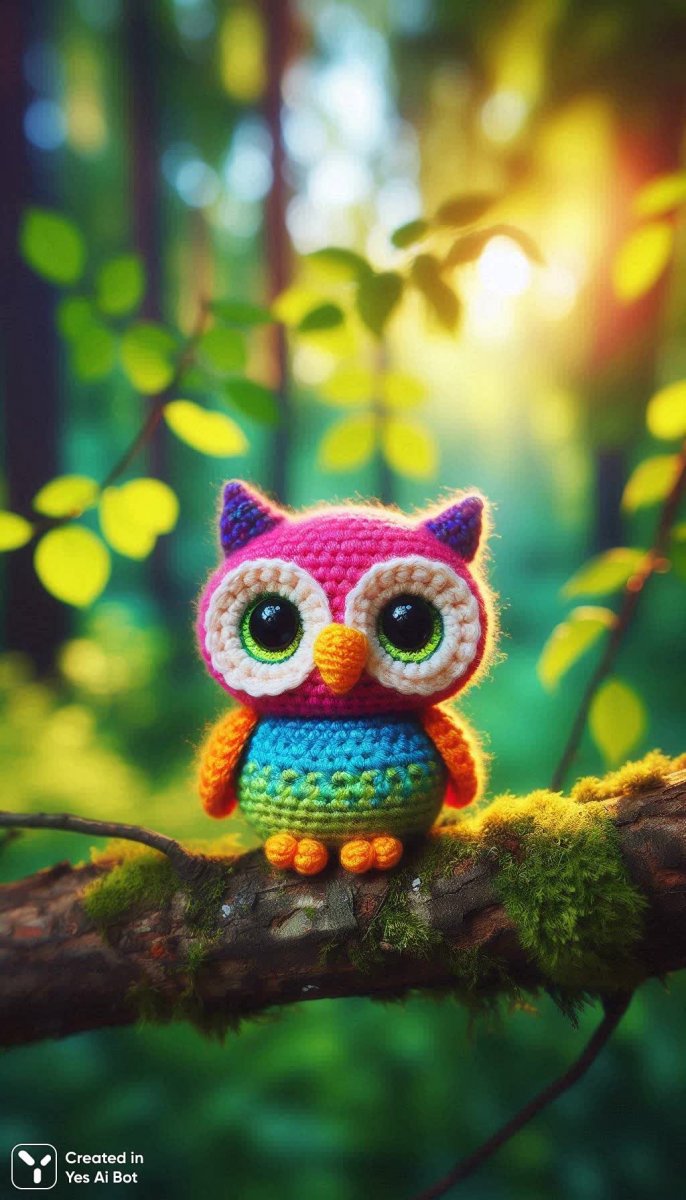 little crocheted owl in bright colors, big round eyes and tufted ears, perched on a branch of a tree, cozy atmosphere with soft sunlight filtering through leaves, playful style, bg is blurred forest.