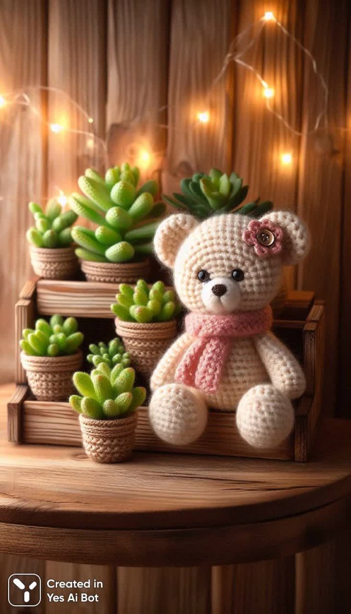 small crochet teddy bear with button eyes and pink scarf, made of soft beige yarn, sitting on a rustic wooden shelf, surrounded by tiny potted plants and fairy lights, cozy and inviting atmosphere, bg is warm beige wood.