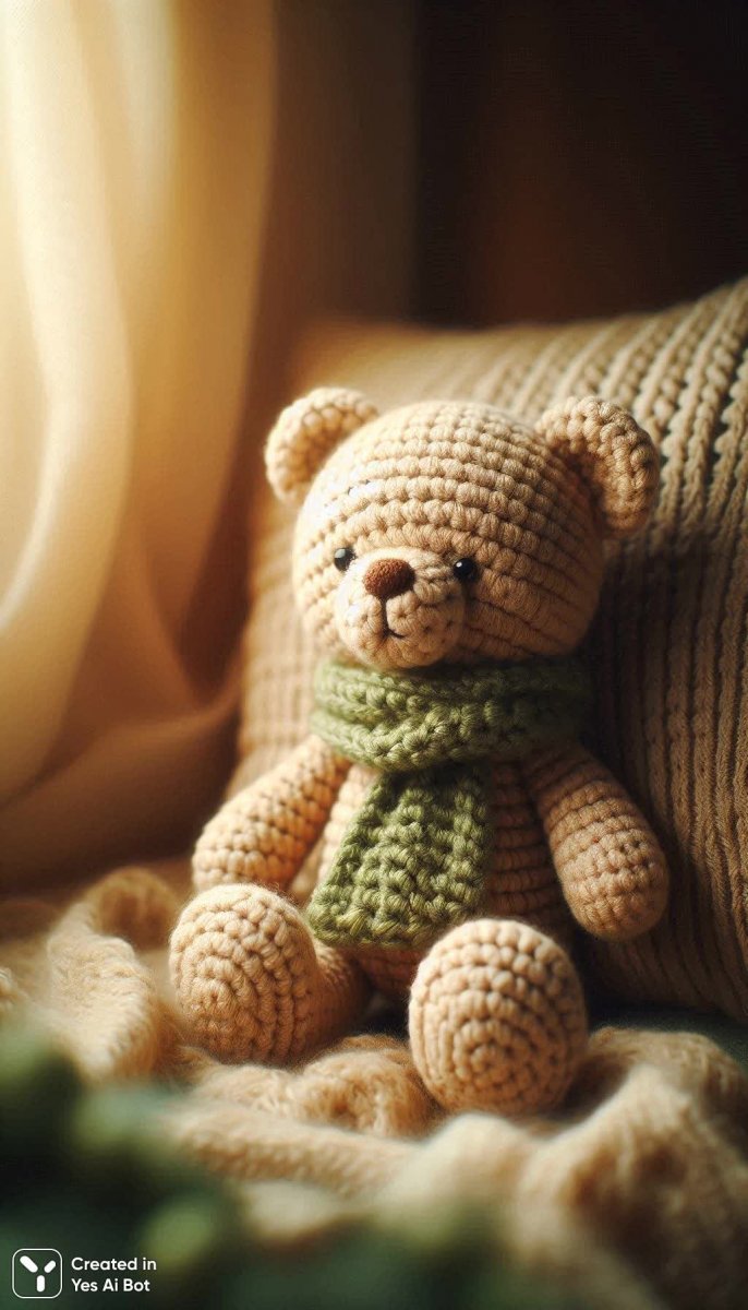 small crocheted bear with small ears and round paws, made of tan yarn, wearing a green scarf, sitting against a plush pillow, cozy setting with warm lighting, soft and cuddly vibe.