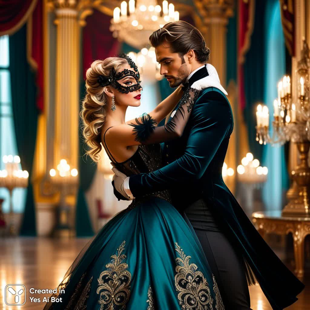She is embraced by a handsome man in a dark teal velvet tailcoat, black gloves, and an ornate matching mask. Their pose is intima...