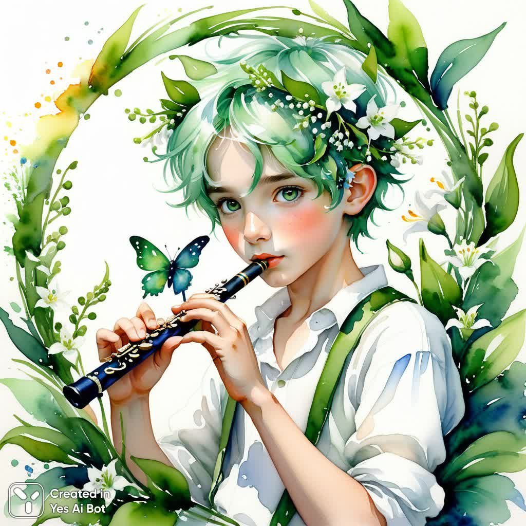 watercolor, acrylic, random pose A green-haired mischievous boy in a wreath of lilies of the valley and young foliage. He plays a flute, and butterflies flutter around him, and everything is blooming and green. He is dressed in a light white shirt. He looks like the embodiment of young spring. style by Arush Votsmus.
