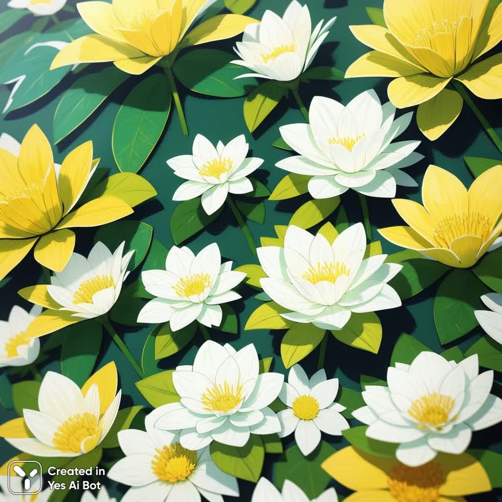3d embossed acrylic paint on canvas, depicting white and yellow flowers with a green background, with a texture of thick impasto paint.