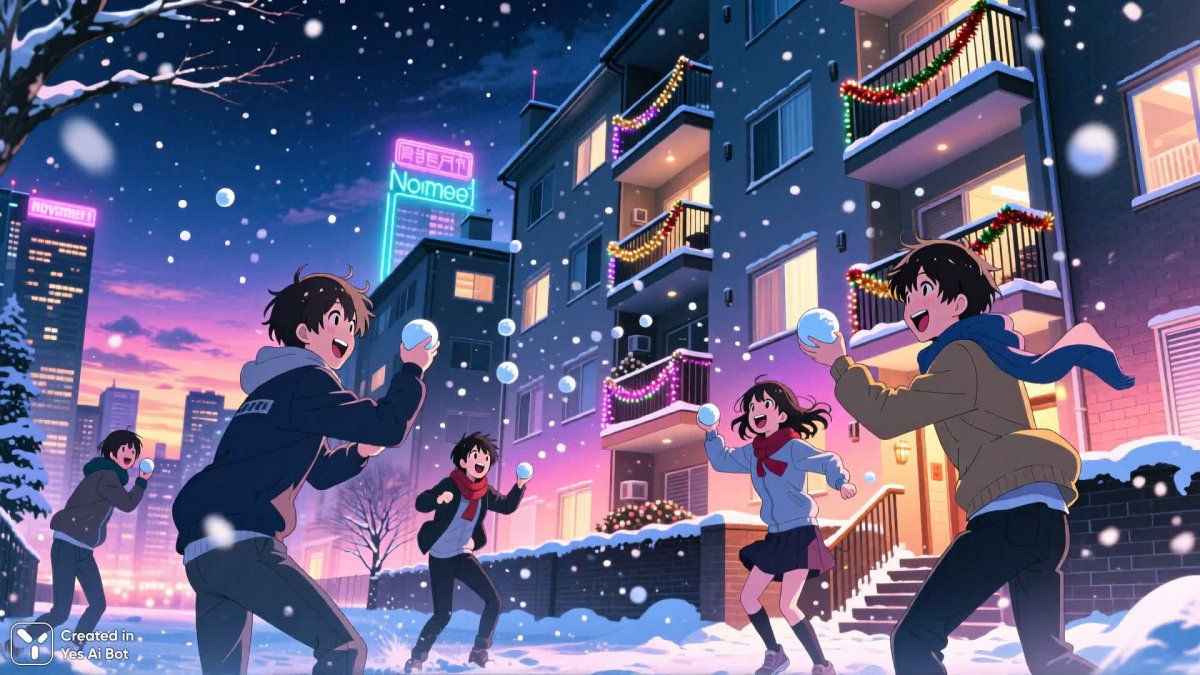 Teenagers having a snowball fight in front of a decorated apartment block, November twilight and city neon blending in the sky, sparkling tinsel on balconies, expressive anime style inspired by Makoto Shinkai, dynamic movement and glowing color gradients, laughter frozen in time, HD, winter night, cgi, 1024K