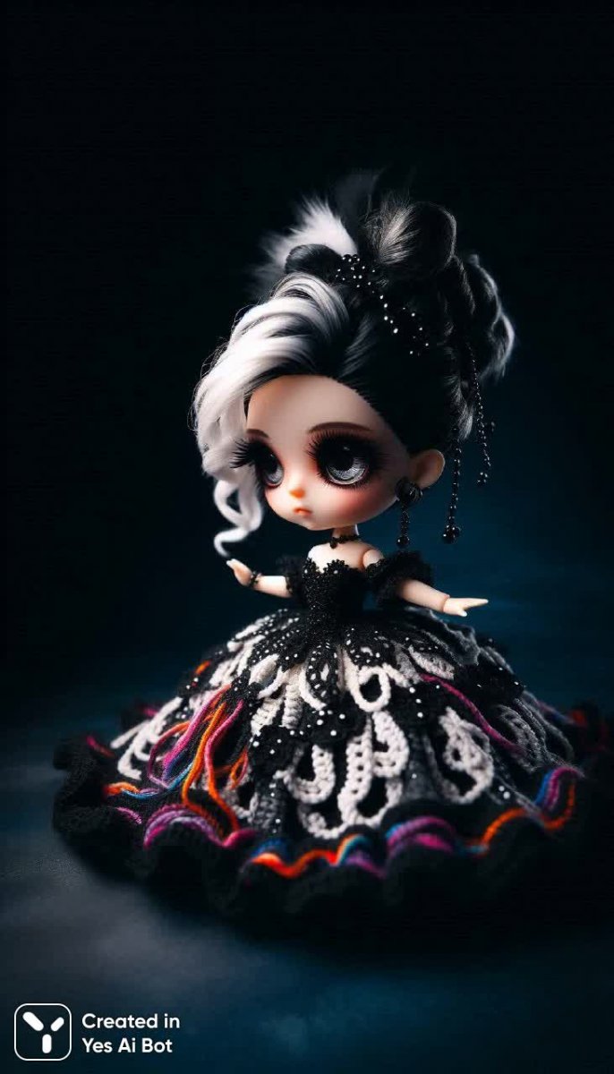 a cute chibi doll wearing a black and white ball gown, crochet, art toys collectible, anime-inspired design, striking a pose, yarn and beads craftsmanship, vibrant colors, dollpunk aesthetic.
