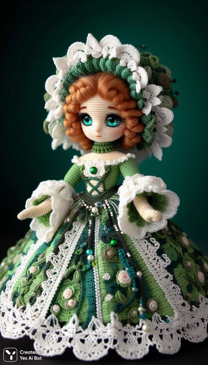 a crocheted doll wearing a green and white historical dress, artdoll, made of yarn and beads, cute porcelain doll, ball jointed doll, vibrant colors, inspired by Victorian fashion, full body pose, intricate details.