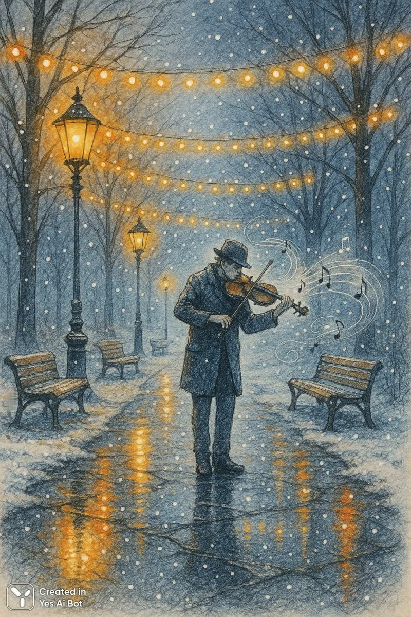 Тихий городской парк в начале ноября, одинокий музыкант играет на скрипке под мерцающими новогодними гирляндами, мягкое свечение фонарей, первый нежный снег, меланхоличное настроение, стилизованный рисунок карандашом с акварельными акцентами, акцент на движении нот и падающем снеге, отражения в лужах, зимнее уединение, яркие краски, световые акценты, cgi, 1024K