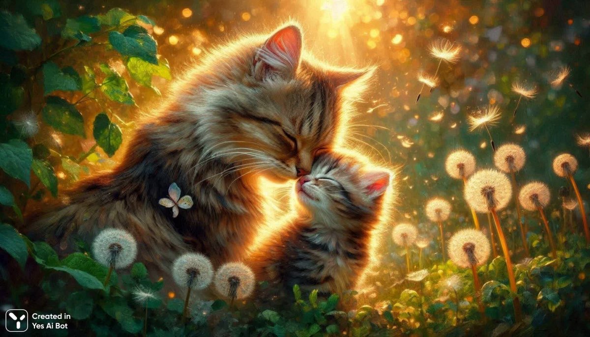 Нежная сцена материнской любви запечатлена в теплом свете золотого часа. Котка нежно прижимается к своему котенку в залитом солнцем саду, окруженном пышной зеленью. Детализированная шерсть передает мягкость и тепло, а размытый фон с плывущими семенами одуванчика создает ощущение мечтательности и безмятежности. Мягкий фокус подчеркивает тонкие усики кошки, добавляя интимности в этот трогательный момент. В воздухе порхают бабочки, создавая атмосферу спокойствия и гармонии. Картина выполнена в манере масляной живописи с использованием теплых землистых тонов, что придает ей особую глубину и реалистичность. Застенчивые формы сердца, спрятанные в лепестках цветов, добавляют романтики и символизма. Запечатленный момент – кошка издает тихий мурлык, наполненный любовью и заботой. Вдохновленная стилем Леонида Афремова, эта цифровая картина (CGI) с высоким разрешением 1024K представляет собой прекрасный пример сочетания реализма и художественной фантазии, передающий красоту природы и теплоту семейных уз в формате цифрового искусства. Это визуальный гимн материнской любви и спокойствию летнего дня