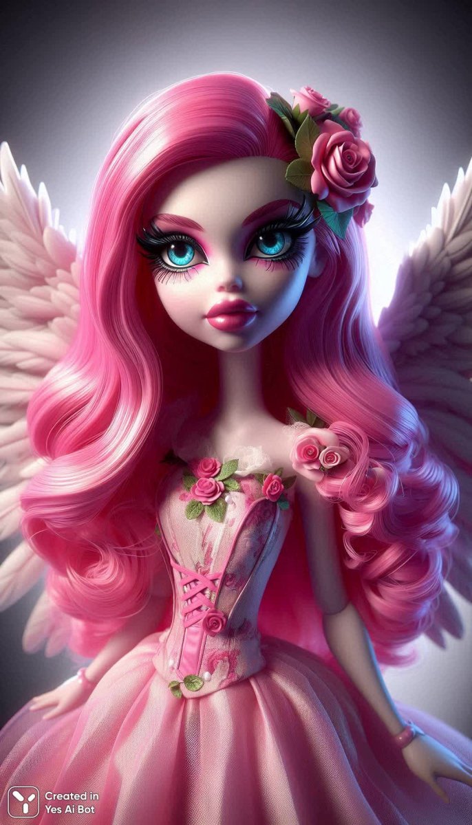 a pink hair monster high doll with angel wings, big expressive bright blue eye makeup, her dress is decorated with roses, soft lighting, shadows, highlights, a white bg, and 3d render.