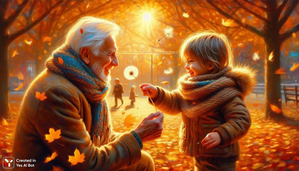 Нежная сцена осеннего дня, запечатлевшая трогательный момент между внуком и бабушкой. Маленький ребенок с искренней любовью дарит дедушке одуванчик в солнечном парке, окруженном золотым дождем опавших листьев. Мягкое освещение проникает сквозь ветви деревьев, создавая атмосферу уюта и тепла. Цветовая палитра насыщена оттенками коричневого и охры, подчеркивающими красоту осенней природы. Реалистичные эмоции переданы через нежный зрительный контакт между героями, а детали, такие как теплые шерстяные шарфы и легкая дымка на дыхании в свежем воздухе, добавляют глубины и достоверности изображению. Картина выполнена в современном импрессионистском стиле, напоминающем работы Jeremy Lipking, с использованием компьютерной графики для создания динамичного эффекта кружащихся листьев и размытого фона детской площадки. В глазах дедушки отражается слезинка радости, свидетельствующая о безграничной любви и счастье от общения с внуком, создавая незабываемое впечатление теплоты и семейного единения в волшебном осеннем пейзаже. Это иллюстрация искренней привязанности и радости простых моментов жизни, наполненная нежностью и светлыми чувствами