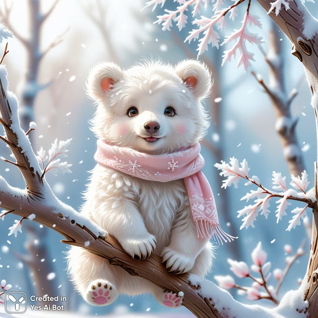Нежная иллюстрация в стиле фэнтези переносит нас в сказочный мир, где очаровательный белый медвежонок с пушистой шерсткой и розовым шарфом стал главным героем. На фоне чистого белого полотна, словно сотканного из снега и света, кроха-медведь смотрит на птицу, уютно устроившуюся на ветке дерева. Вокруг танцуют легкие снежинки, создавая атмосферу зимней сказки и волшебства. Изображение пронизано деликатной филигранью и напоминает анимацию Disney, сочетая в себе наивность детского рисунка и изысканность художественного исполнения. Нежные узоры и текстуры добавляют композиции объема и глубины, а мягкий белый цвет подчеркивает чистоту и невинность главного персонажа. Эта миниатюра – воплощение доброты и тепла, запечатленное в морозном пейзаже. Каждый элемент иллюстрации тщательно продуман: от пушистой шерстки медвежонка до искрящихся снежинок, создавая ощущение сказочной реальности. Это произведение искусства станет прекрасным украшением для детской комнаты или подарком близкому человеку, напоминающим о волшебстве и чудесах зимнего леса. Оно излучает спокойствие и умиротворение, словно приглашая нас окунуться в мир грез и фантазий, где все возможно и мечты сбываются
