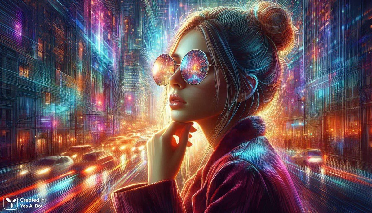 A young woman with oversized round glasses, gazing thoughtfully at a kaleidoscopic cityscape, intricate reflections and spectral lights in each lens, vivid color bursts, soft velvet coat with a tactile texture, hair strands highlighted by neon, urban rain falling in slow motion, humming traffic, photorealistic style, bright iridescent accents, by artist Greg Rutkowski, present tense, cgi, 1024K