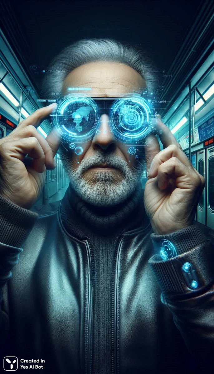 Пожилой мужчина с заботливым выражением лица аккуратно подстраивает футуристические прозрачные умные очки. Возле его лица зависли цифровые голограммы, словно ожившие проекции, демонстрирующие детализированные карты города будущего. Мягкое голубое свечение деликатно освещает тонкие морщинки на лице, рассказывая историю прожитых лет и мудрости. На нем надета элегантная куртка из матового шлифованного металла, добавляющая образу современный штрих. В воздухе чувствуется оживленная атмосфера шумной подземки, наполненная движением и энергией. Изображение выполнено в виде трехмерной визуализации в узнаваемом стиле Pixar, с акцентом на выразительных глазах, которые отражают смесь любопытства и легкой задумчивости. Кажется, будто застывший момент времени переносит нас в недалекое будущее, где технологии гармонично интегрированы в повседневную жизнь. Цифровые элементы, такие как голографические карты, создают ощущение инноваций и прогресса. Тщательно проработанные металлические текстуры куртки добавляют реалистичности и детализации изображению. Качество изображения достигает поразительных 1024K, обеспечивая невероятную четкость и детализацию каждой линии и поверхности. Это яркий пример будущего, где передовые технологии сочетаются с человеческим опытом, создавая завораживающую картину. Использование cgi позволяет создать нереалистичную, но притягательную атмосферу, захватывающую воображение зрителя