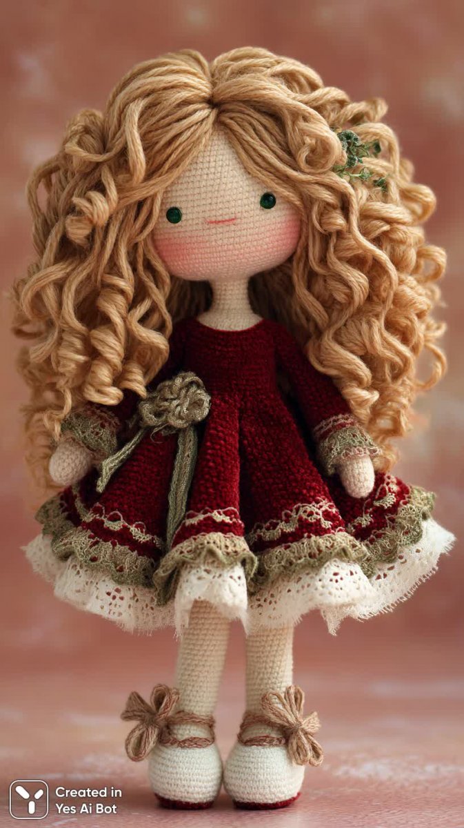 Очаровательная кукла ручной работы, созданная с использованием техники вязания крючком, излучает тепло и уют. Её волнистые золотистые волосы мягко ниспадают на плечи, обрамляя круглое личико с выразительными зелёными глазами, полными невинности и дружелюбия. Наряд куклы – это настоящее произведение искусства: элегантное красное бархатное платье украшено изысканной кружевной отделкой, добавляющей образу роскоши и шарма. Маленькие белые туфельки с милыми бантиками завершают ансамбль, подчеркивая игривый характер куклы. Мягкий пастельно-розовый фон создает атмосферу нежности и спокойствия, позволяя полностью сосредоточиться на деталях исполнения и очаровательной улыбке куклы. Высококачественное исполнение и деликатное освещение подчеркивают тонкость кропотливой работы мастера, передавая тепло рук создателя и любовь к деталям. Эта кукла – не просто игрушка, а символ тепла, заботы и безграничной фантазии, способный подарить радость и вдохновение своим обладателям. Её мягкие текстуры и приятные на ощупь материалы делают её идеальным спутником для игр и объятий, а изысканный дизайн станет украшением любой коллекции кукол или подарком для близкого человека