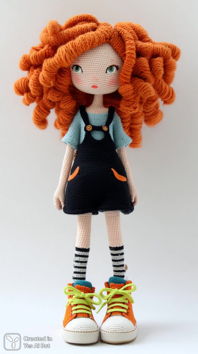 Crochet doll with fiery orange hair, wearing a striped black and white dungaree dress over a blue t-shirt, high-top sneakers with neon laces, round face with small mouth and bright eyes, standing on plain white BG, high-quality, bright lighting, capturing the vibrant essence of the doll's style.