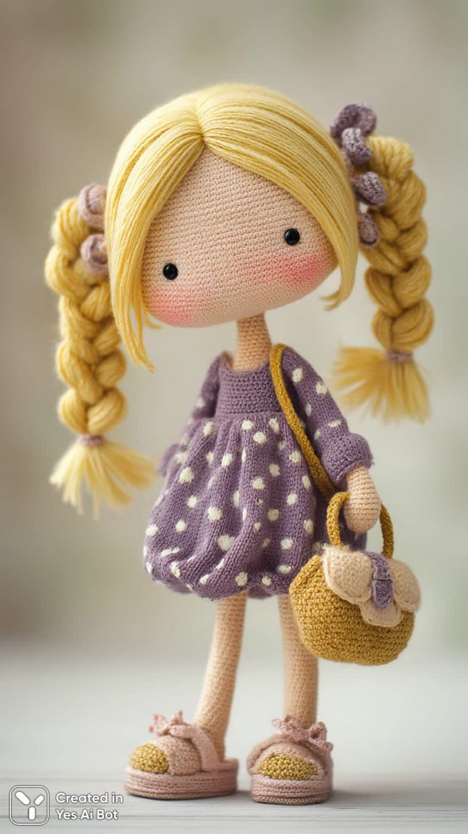 crocheted doll with bright yellow hair styled in two braids, large expressive eyes and rosy cheeks, wearing a purple dress with white polka dots, pink sandals, holding a small pink handbag, standing cheerfully against a white background.