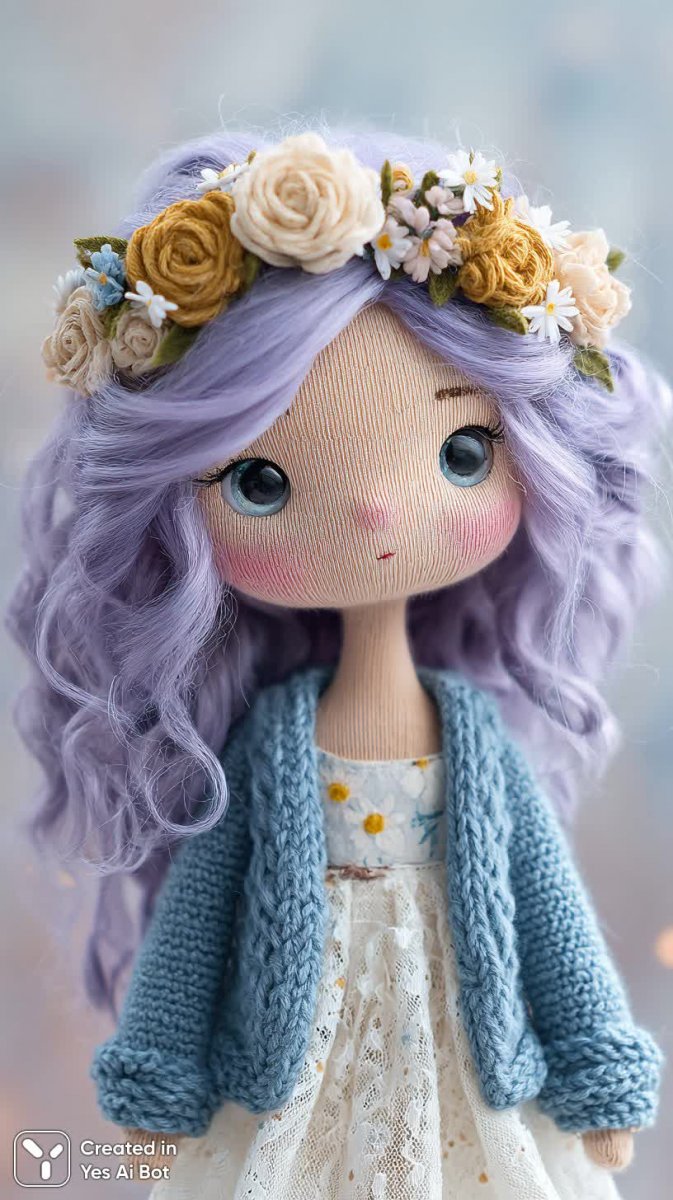 Милая вязаная кукла с длинными волнистыми лавандовыми волосами излучает нежность и радость. На ней очаровательный пастельно-голубой кардиган поверх белого платья, создавая образ воздушной и беззаботной девочки. Куклу окружает сказочный мир, сотканный из вязаных цветов и деревьев – это настоящий оазис рукодельного искусства. Большие круглые глаза куклы искрятся весельем, приглашая в мир фантазий и детских мечтаний. Фон выполнен в белом цвете, что позволяет выделить яркие детали и подчеркнуть мягкость текстуры вязаных элементов. Эта игрушка станет прекрасным подарком для ребенка или любимого человека, а также украшением интерьера, добавляя уюта и тепла любому дому. Она словно соткана из солнечного света и добрых пожеланий, воплощая в себе очарование ручной работы и неповторимость каждого стежка. Вязаные цветы и деревья создают атмосферу волшебного сада, где живут сказки и оживают мечты. Кукла излучает позитив и дарит ощущение спокойствия и умиротворения. Ее лавандовые волосы мягко развеваются на ветру, а голубой кардиган добавляет образу свежести и легкости. Белый фон подчеркивает чистоту и невинность куклы, делая ее еще более привлекательной и запоминающейся. Это настоящая миниатюрная вселенная, созданная с любовью и заботой