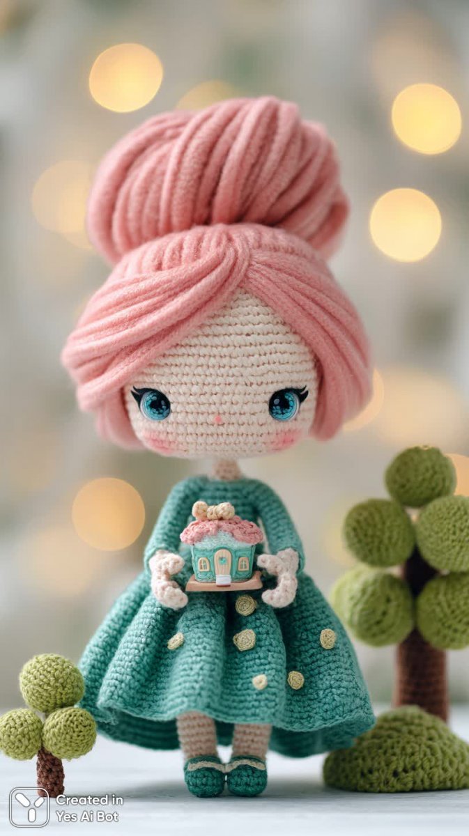 crocheted doll with fluffy pink hair styled in a bun, wearing a bright green dress with white polka dots, holding a tiny crocheted house in hands, big blue eyes, standing in front of a crocheted tree, BG is white.