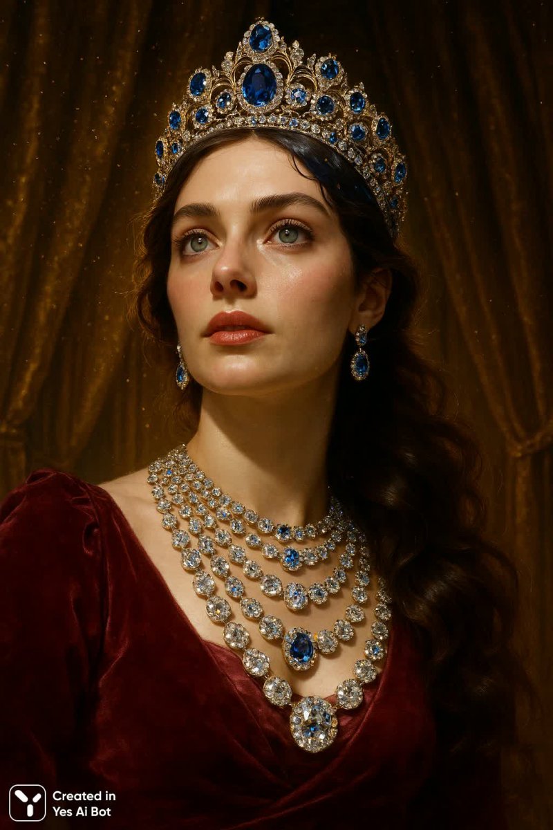 Женщина с изумрудными глазами, в изысканной тиаре из сапфиров, слои бриллиантовых ожерелий на шелковом бордовом платье, мерцающая золотая пыль в воздухе, бархатные шторы на заднем плане, крупный план с нижнего ракурса, гиперреалистичная текстура, сверкающие отражения драгоценных камней, акценты металлическим блеском, тонкое движение волос, освещение в стиле Ренессанса, атмосфера насыщена ароматом амбры, интерьер роскошного дворца, стиль Густава Климта, cgi, 1024K