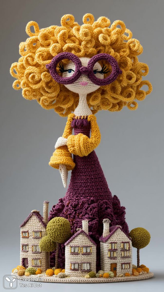 Милая вязаная кукла с неповторимым шармом – воплощение тепла и уюта. Её пышные кудрявые волосы цвета солнца контрастируют с изящным фиолетовым платьем, а забавные очки добавляют игривости образу. Кукла словно приветствует вас открытыми объятиями, создавая ощущение гостеприимства и радости. Рядом располагается очаровательная деревня из крошечных вязаных домиков, каждый из которых пропитан домашним уютом и мастерством рукоделия. Белый фон подчеркивает чистоту и нежность композиции, позволяя полностью сосредоточиться на деталях и красоте этой уникальной сцены. Эта работа – прекрасный пример текстильного искусства, сочетающего в себе оригинальность дизайна, внимательность к мелочам и любовь к ручной работе. Кукла и её вязаные домики излучают позитив и создают атмосферу сказки, способную согреть сердце и подарить улыбку каждому зрителю. Это не просто игрушка, а настоящее произведение искусства, которое станет прекрасным украшением интерьера или особенным подарком для близкого человека. Вязаная кукла с кудрявыми волосами – символ доброты, творчества и волшебства, воплощенный в каждом стежке