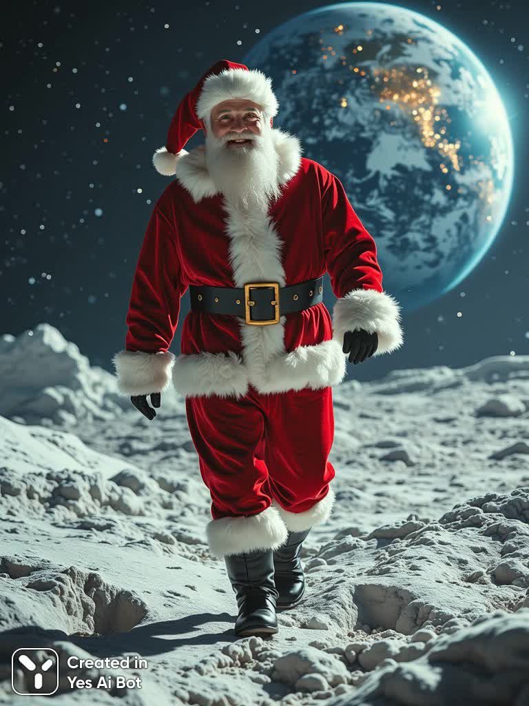 Santa Claus, Caucasian, aged 60s, strides forward across a moon-like surface, a vast Earth glowing in the background. Santa, clad in a classic red velvet suit, white fur trim, black boots, a black belt with gold buckle, and a matching red hat, gazes forward with a cheerful expression. His white beard is full and flowing. The moon's surface, a detailed, textured expanse of gray and white, displays subtle shadows and footprints, suggesting movement. The Earth, occupying the upper right, showcases continents, illuminated cities, and a blue and white atmosphere. The overall composition is a medium shot with a low angle, emphasizing the setting. T...