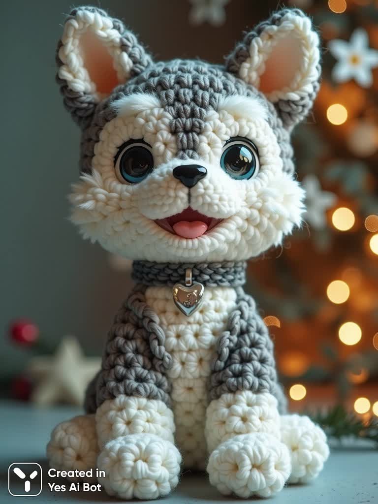 Милая вязаная игрушка ручной работы – плюшевый хаски, излучающий радость и очарование. Этот трогательный персонаж запечатлен во фронтальном среднем кадре, сидящий прямо с внимательным взглядом и едва заметной улыбкой, демонстрирующей нежный розовый язычок. Хаски выполнен в изящном сочетании серого и белого цветов: тело преимущественно серое, плавно переходящее в белый цвет на лапках, груди и мордочке. Его украшает небольшое серебряное сердце на шее, подчеркнутое темно-серой вязаной подковой. Фоном служит мягкий серый фон, украшенный парящими белыми фигурками в форме звезд и цветов, создающими сказочную атмосферу. Мягкое рассеянное освещение деликатно акцентирует текстуру пряжи, придавая общей картине теплоту и уют. Вязаная собачка невероятно мягкая на ощупь, что только усиливает ощущение комфорта и игривости. Эта плюшевая игрушка – воплощение тепла домашнего очага, ручной работы и волшебства, словно сошедшая со страниц любимой сказки. Она станет прекрасным подарком или просто милым украшением для создания уюта в доме