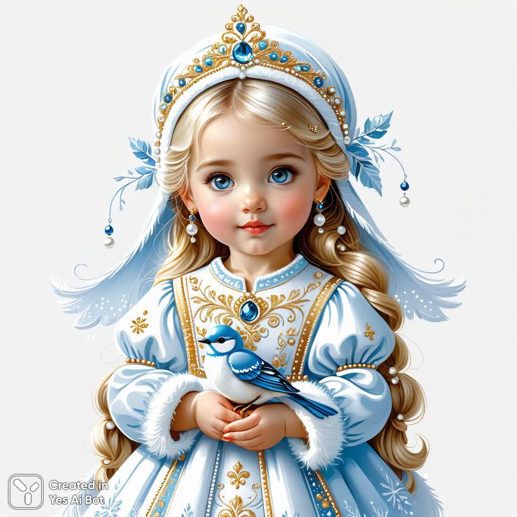 Нежная зимняя сказка оживает на полотне в формате 2D иллюстрации. В центре композиции – очаровательная Снегурочка, воплощенная с любовью и вниманием к деталям. Её полный рост позволяет рассмотреть изящный силуэт, облаченный в роскошное платье небесно-голубых и белоснежных оттенков. Тонкая золотая вышивка придает наряду особое очарование, а пышный снежный шлейф, украшенный жемчугом и сверкающими стразами, создает впечатление волшебства и морозной красоты. Особое внимание привлекают выразительные глаза Снегурочки с длинными, изящно изогнутыми ресницами – они словно излучают чистоту и невинность. На ладошке она бережно держит маленькую птичку, полную жизни и радости, чьи внимательные глазки смотрят прямо на зрителя. Иллюстрация выполнена в высоком разрешении с четкими контурами и мельчайшей проработкой деталей, что позволяет оценить мастерство художницы Марины Касперской. Яркая цветовая палитра создает атмосферу праздника и волшебства, а белоснежный фон подчеркивает воздушность и легкость образа. Это произведение искусства – настоящая жемчужина в мире цифрового искусства, способная подарить зрителям ощущение чуда и зимнего тепла. Каждая деталь, от мельчайших узоров на платье до выразительного взгляда птички, продумана с любовью и профессионализмом, делая эту иллюстрацию по-настоящему уникальной и запоминающейся. Она словно сошла со страниц волшебной сказки, чтобы подарить радость и вдохновение всем, кто увидит её