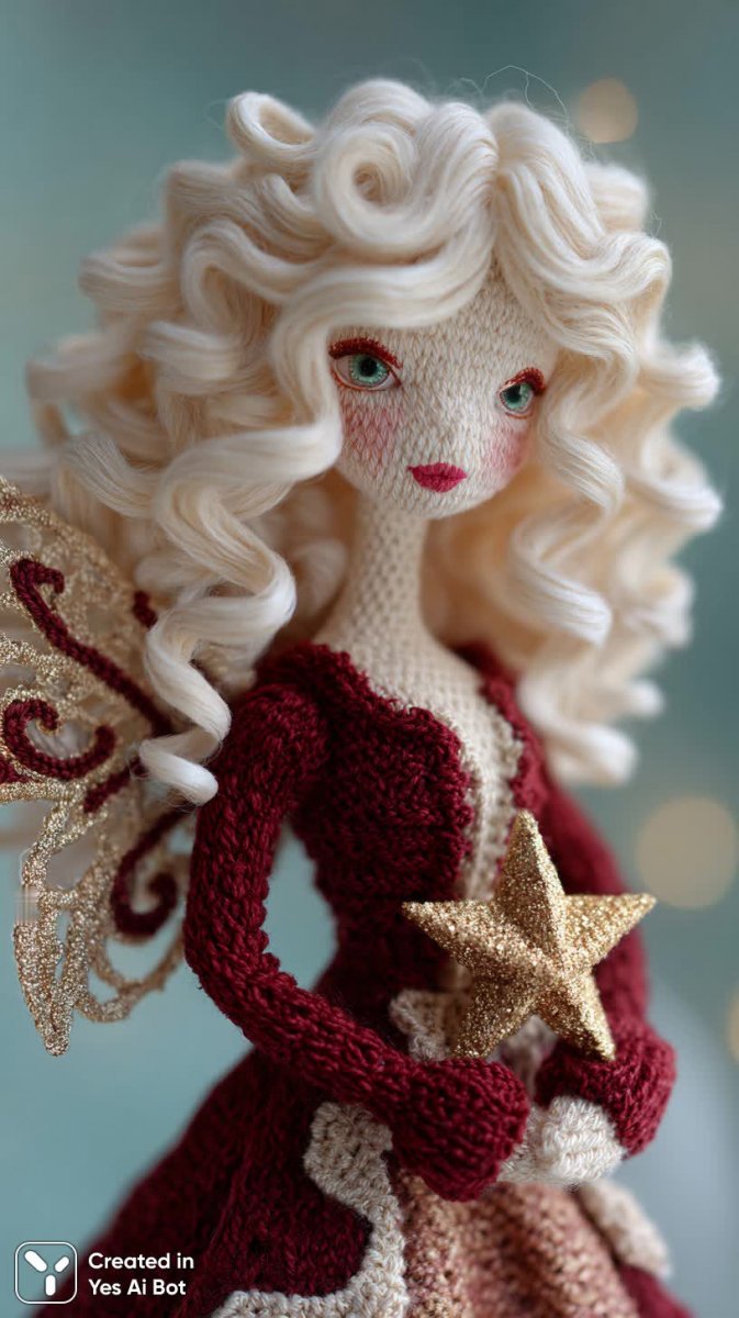 crocheted doll with white hair styled in curls, wearing a sparkly red dress with gold accents, holding a tiny golden star, adorned with festive silver wings, BG is soft pastel blue, high-quality, warm lighting, capturing the whimsical holiday spirit and intricate crochet details.