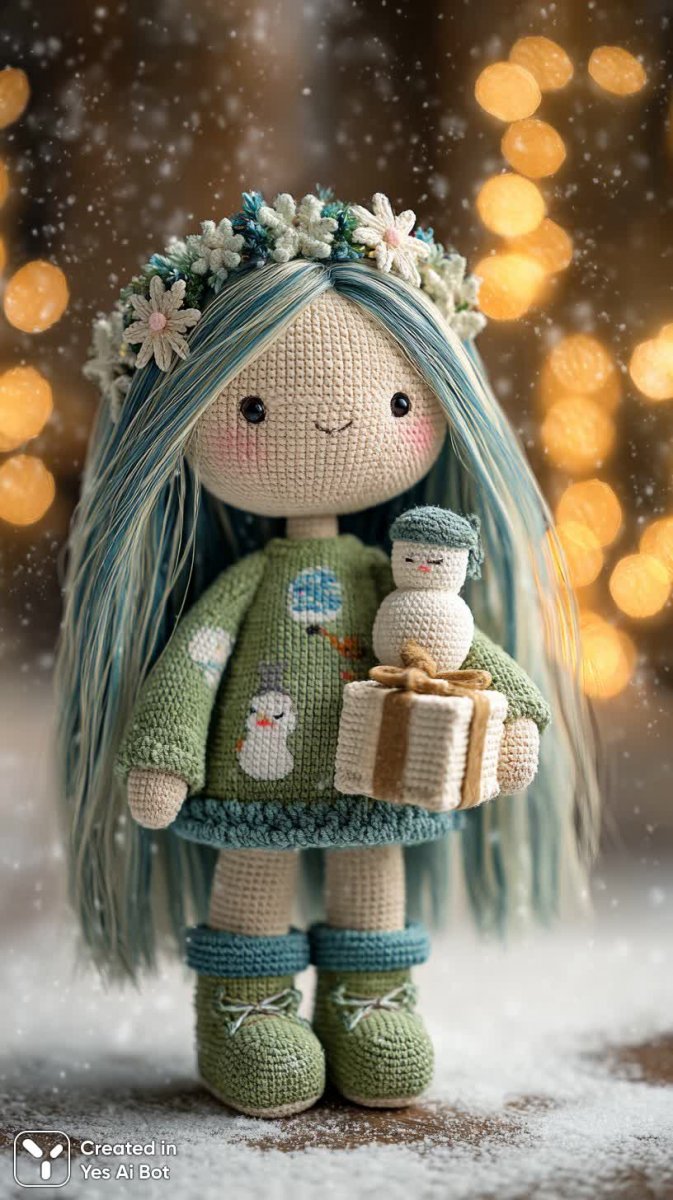 Очаровательная вязаная кукла воплощает дух зимней сказки. Ее нежные голубые и белые волосы заплетены в изящную снежинку, добавляя образу легкости и волшебства. Уютный зеленый свитер с милым рисунком снеговика согревает маленькую модницу, а теплые вязаные ботинки завершают ее зимний наряд. В руках кукла бережно держит небольшую подарочную коробочку, полную сюрпризов и радости. Мягкое освещение подчеркивает детали кропотливой работы крючком, создавая атмосферу тепла и уюта. Фон – завораживающий пейзаж заснеженной местности с легким намеком на зимние праздники. Высочайшее качество исполнения и внимание к деталям делают эту куклу настоящим произведением искусства, способным подарить радость и хорошее настроение всем вокруг. Эта очаровательная игрушка станет прекрасным подарком для детей и взрослых, любителей вязаных изделий и всего волшебного. Она словно соткана из зимнего волшебства и нежности, способная напомнить о самых светлых моментах праздничного сезона. Это больше, чем просто кукла – это символ тепла, уюта и радости, который будет дарить положительные эмоции долгие годы. Идеальный аксессуар для создания уютной атмосферы дома или прекрасный подарок для близкого человека