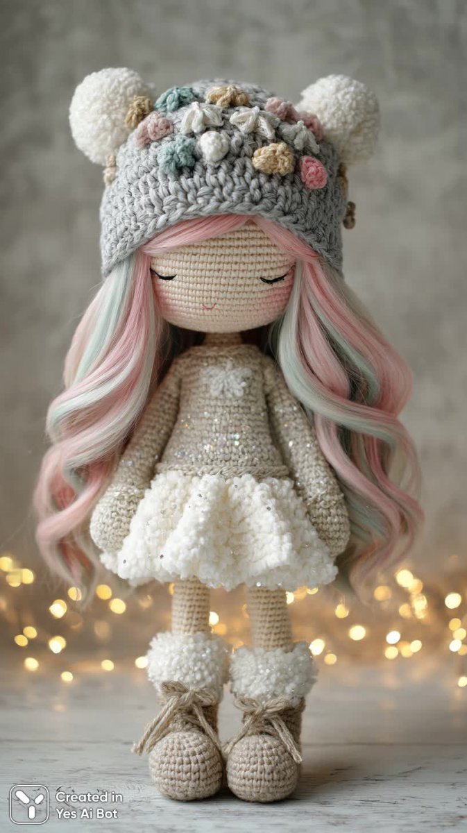 crocheted doll with pastel colored hair, wearing a fluffy white skirting with sequined snowflakes, pom-pom hat with ear flaps, surrounded by small holiday ornaments, BG is gentle gray, high-quality, warm lighting, capturing the joyful essence of the season and the fine crochet techniques.