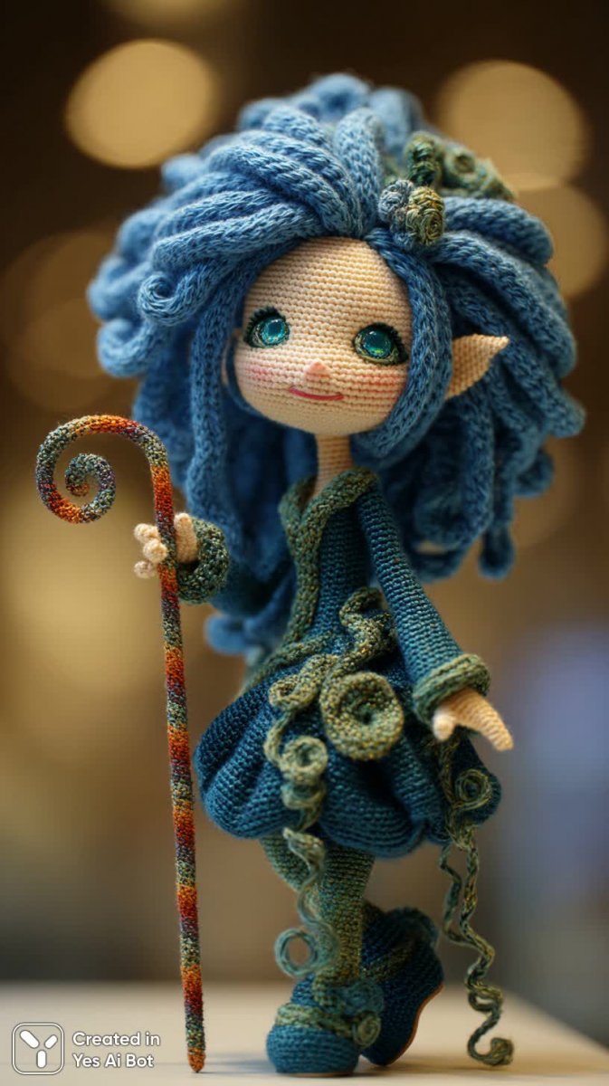 crocheted doll with bright blue hair, dressed in a festive elf outfit with stripes, holding a tiny colorful candy cane, round face with twinkling green eyes, standing upright on white BG, high-quality, soft lighting, emphasizing whimsical charm and vibrant colors of the holiday theme.